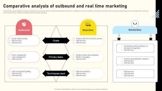 The following slide depicts comparison of outbound and real time promotional techniques to determine key differences and similarities. It includes elements such as social media posting, event management, analyzing customer journeys, mobile messaging, lead scoring and grading, Find a pre designed and impeccable Incorporating Real Time Marketing For Improved Consumer Comparative Analysis Of Outbound Ideas PDF. The templates can ace your presentation without additional effort. You can download these easy to edit presentation templates to make your presentation stand out from others. So, what are you waiting for Download the template from Slidegeeks today and give a unique touch to your presentation.