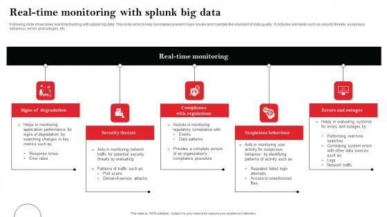 Following slide showcases real-time tracking with splunk big data. This slide aims to help businesses prevent major issues and maintain the standard of data quality. It includes elements such as security threats, suspicious behaviour, errors and outages, etc. Pitch your topic with ease and precision using this Real Time Monitoring With Splunk Big Data Diagrams Pdf This layout presents information on Signs Of Degradation, Security Threats, Errors And Outages It is also available for immediate download and adjustment. So, changes can be made in the color, design, graphics or any other component to create a unique layout. Following slide showcases real-time tracking with splunk big data. This slide aims to help businesses prevent major issues and maintain the standard of data quality. It includes elements such as security threats, suspicious behaviour, errors and outages, etc.