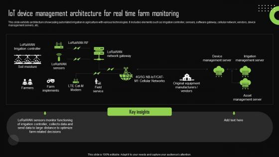 This slide exhibits architecture showcasing automated irrigation in agriculture with various technologies. It includes elements such as irrigation controller, sensors, software gateway, cellular network, vendors, device management servers, etc. Find a pre-designed and impeccable IoT Device Management Fundamentals IoT Device Management Architecture For Real Time IoT SS V. The templates can ace your presentation without additional effort. You can download these easy-to-edit presentation templates to make your presentation stand out from others. So, what are you waiting for Download the template from Slidegeeks today and give a unique touch to your presentation. This slide exhibits architecture showcasing automated irrigation in agriculture with various technologies. It includes elements such as irrigation controller, sensors, software gateway, cellular network, vendors, device management servers, etc.