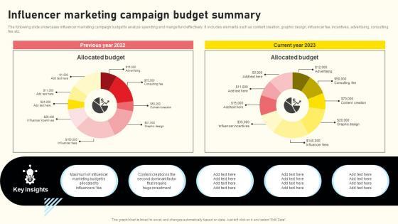 The following slide showcases influencer marketing campaign budget to analyze spending and mange fund effectively. It includes elements such as content creation, graphic design, influencer fee, incentives, advertising, consulting fee etc. Slidegeeks is one of the best resources for PowerPoint templates. You can download easily and regulate Effective Real Time Marketing Principles Influencer Marketing Campaign Budget Summary Sample Pdf for your personal presentations from our wonderful collection. A few clicks is all it takes to discover and get the most relevant and appropriate templates. Use our Templates to add a unique zing and appeal to your presentation and meetings. All the slides are easy to edit and you can use them even for advertisement purposes. The following slide showcases influencer marketing campaign budget to analyze spending and mange fund effectively. It includes elements such as content creation, graphic design, influencer fee, incentives, advertising, consulting fee etc.