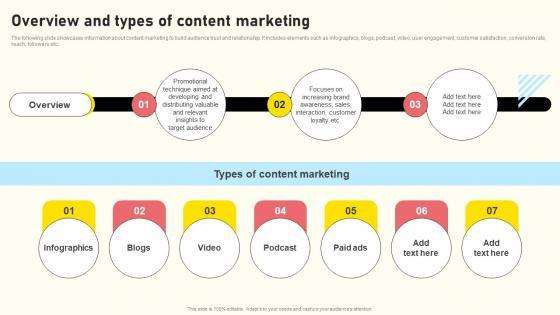 The following slide showcases information about content marketing to build audience trust and relationship. It includes elements such as infographics, blogs, podcast, video, user engagement, customer satisfaction, conversion rate, reach, followers etc. The best PPT templates are a great way to save time, energy, and resources. Slidegeeks have 100 percent editable powerpoint slides making them incredibly versatile. With these quality presentation templates, you can create a captivating and memorable presentation by combining visually appealing slides and effectively communicating your message. Download Effective Real Time Marketing Principles Overview And Types Of Content Marketing Diagrams Pdf from Slidegeeks and deliver a wonderful presentation. The following slide showcases information about content marketing to build audience trust and relationship. It includes elements such as infographics, blogs, podcast, video, user engagement, customer satisfaction, conversion rate, reach, followers etc.