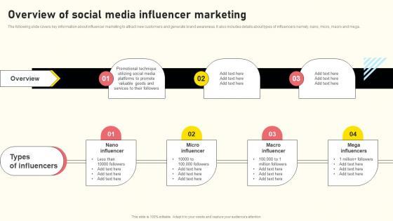 The following slide covers key information about influencer marketing to attract new customers and generate brand awareness. It also includes details about types of influencers namely, nano, micro, macro and mega. The Effective Real Time Marketing Principles Overview Of Social Media Influencer Marketing Microsoft Pdf is a compilation of the most recent design trends as a series of slides. It is suitable for any subject or industry presentation, containing attractive visuals and photo spots for businesses to clearly express their messages. This template contains a variety of slides for the user to input data, such as structures to contrast two elements, bullet points, and slides for written information. Slidegeeks is prepared to create an impression. The following slide covers key information about influencer marketing to attract new customers and generate brand awareness. It also includes details about types of influencers namely, nano, micro, macro and mega.