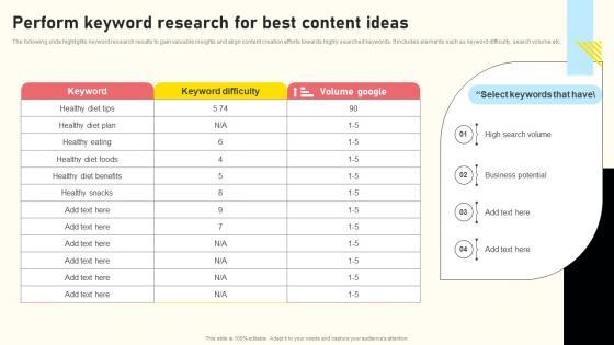 The following slide highlights keyword research results to gain valuable insights and align content creation efforts towards highly searched keywords. It includes elements such as keyword difficulty, search volume etc. Slidegeeks has constructed Effective Real Time Marketing Principles Perform Keyword Research For Best Content Ideas Demonstration Pdf after conducting extensive research and examination. These presentation templates are constantly being generated and modified based on user preferences and critiques from editors. Here, you will find the most attractive templates for a range of purposes while taking into account ratings and remarks from users regarding the content. This is an excellent jumping-off point to explore our content and will give new users an insight into our top-notch PowerPoint Templates. The following slide highlights keyword research results to gain valuable insights and align content creation efforts towards highly searched keywords. It includes elements such as keyword difficulty, search volume etc.