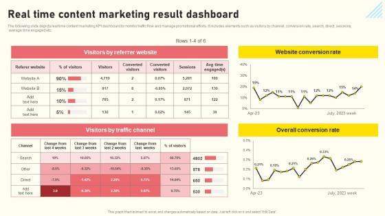The following slide depicts real time content marketing KPI dashboard to monitor traffic flow and manage promotional efforts. It includes elements such as visitors by channel, conversion rate, search, direct, sessions, average time engaged etc. The Real Time Content Marketing Result Dashboard Ppt Infographic Template Example PDF is a compilation of the most recent design trends as a series of slides. It is suitable for any subject or industry presentation, containing attractive visuals and photo spots for businesses to clearly express their messages. This template contains a variety of slides for the user to input data, such as structures to contrast two elements, bullet points, and slides for written information. Slidegeeks is prepared to create an impression.