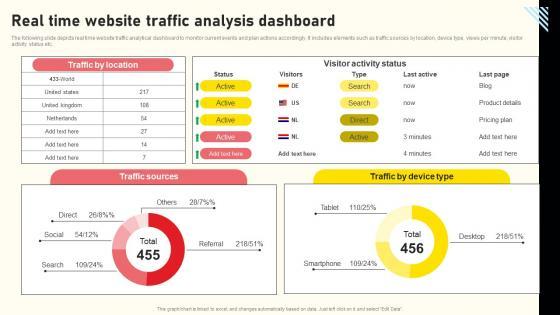 The following slide depicts real time website traffic analytical dashboard to monitor current events and plan actions accordingly. It includes elements such as traffic sources by location, device type, views per minute, visitor activity status etc. Present like a pro with Effective Real Time Marketing Principles Real Time Website Traffic Analysis Dashboard Graphics Pdf Create beautiful presentations together with your team, using our easy-to-use presentation slides. Share your ideas in real-time and make changes on the fly by downloading our templates. So whether you are in the office, on the go, or in a remote location, you can stay in sync with your team and present your ideas with confidence. With Slidegeeks presentation got a whole lot easier. Grab these presentations today. The following slide depicts real time website traffic analytical dashboard to monitor current events and plan actions accordingly. It includes elements such as traffic sources by location, device type, views per minute, visitor activity status etc.