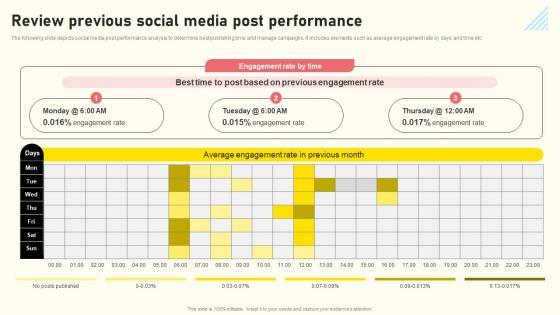 The following slide depicts social media post performance analysis to determine best publishing time and manage campaigns. It includes elements such as average engagement rate by days and time etc. This Effective Real Time Marketing Principles Review Previous Social Media Post Performance Ideas Pdf from Slidegeeks makes it easy to present information on your topic with precision. It provides customization options, so you can make changes to the colors, design, graphics, or any other component to create a unique layout. It is also available for immediate download, so you can begin using it right away. Slidegeeks has done good research to ensure that you have everything you need to make your presentation stand out. Make a name out there for a brilliant performance. The following slide depicts social media post performance analysis to determine best publishing time and manage campaigns. It includes elements such as average engagement rate by days and time etc.