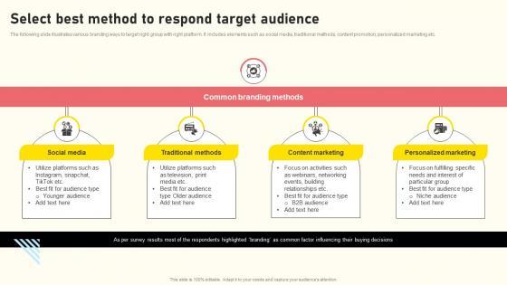 The following slide illustrates various branding ways to target right group with right platform. It includes elements such as social media, traditional methods, content promotion, personalized marketing etc. Do you know about Slidesgeeks Effective Real Time Marketing Principles Select Best Method To Respond Target Audience Icons Pdf These are perfect for delivering any kind od presentation. Using it, create PowerPoint presentations that communicate your ideas and engage audiences. Save time and effort by using our pre-designed presentation templates that are perfect for a wide range of topic. Our vast selection of designs covers a range of styles, from creative to business, and are all highly customizable and easy to edit. Download as a PowerPoint template or use them as Google Slides themes. The following slide illustrates various branding ways to target right group with right platform. It includes elements such as social media, traditional methods, content promotion, personalized marketing etc.