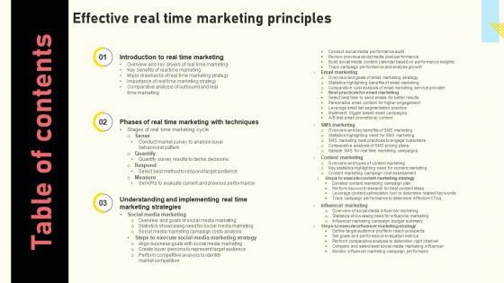 This Table Of Contents Effective Real Time Marketing Principles Themes Pdf is perfect for any presentation, be it in front of clients or colleagues. It is a versatile and stylish solution for organizing your meetings. The Table Of Contents Effective Real Time Marketing Principles Themes Pdf features a modern design for your presentation meetings. The adjustable and customizable slides provide unlimited possibilities for acing up your presentation. Slidegeeks has done all the homework before launching the product for you. So, do not wait, grab the presentation templates today Our Table Of Contents Effective Real Time Marketing Principles Themes Pdf are topically designed to provide an attractive backdrop to any subject. Use them to look like a presentation pro.