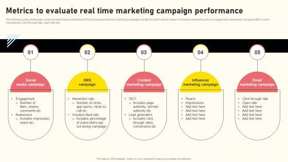 The following slide showcases some key performance indicators KPIs to assess real time marketing campaign results for performance review. It includes elements such as engagement, awareness, led generation, reach, impressions, click through rate, open rate etc. Formulating a presentation can take up a lot of effort and time, so the content and message should always be the primary focus. The visuals of the PowerPoint can enhance the presenters message, so our Incorporating Real Time Marketing For Improved Consumer Metrics To Evaluate Real Time Marketing Summary PDF was created to help save time. Instead of worrying about the design, the presenter can concentrate on the message while our designers work on creating the ideal templates for whatever situation is needed. Slidegeeks has experts for everything from amazing designs to valuable content, we have put everything into Incorporating Real Time Marketing For Improved Consumer Metrics To Evaluate Real Time Marketing Summary PDF