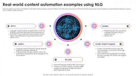 This slide outlines some real-world instances of automated content generation using NLG methods. This slide aims to showcase the different real-world examples that use NLG techniques for automating text generation, such as GPT-3, LaMDA, Wu-Dao, and so on. From laying roadmaps to briefing everything in detail, our templates are perfect for you. You can set the stage with your presentation slides. All you have to do is download these easy-to-edit and customizable templates. Real World Content Automation Examples Using NLG Natural Language Automation will help you deliver an outstanding performance that everyone would remember and praise you for. Do download this presentation today. This slide outlines some real-world instances of automated content generation using NLG methods. This slide aims to showcase the different real-world examples that use NLG techniques for automating text generation, such as GPT-3, LaMDA, Wu-Dao, and so on.