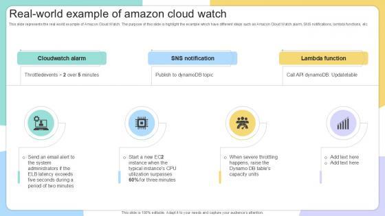 This slide represents the real world example of Amazon Cloud Watch. The purpose of this slide is highlight the example which have different steps such as Amazon Cloud Watch alarm, SNS notifications, lambda functions, etc. Do you have an important presentation coming up Are you looking for something that will make your presentation stand out from the rest Look no further than Real World Example Of Amazon IAC Tools For Performance Analysis PPT Presentation. With our professional designs, you can trust that your presentation will pop and make delivering it a smooth process. And with Slidegeeks, you can trust that your presentation will be unique and memorable. So why wait Grab Real World Example Of Amazon IAC Tools For Performance Analysis PPT Presentation today and make your presentation stand out from the rest This slide represents the real world example of Amazon Cloud Watch. The purpose of this slide is highlight the example which have different steps such as Amazon Cloud Watch alarm, SNS notifications, lambda functions, etc.