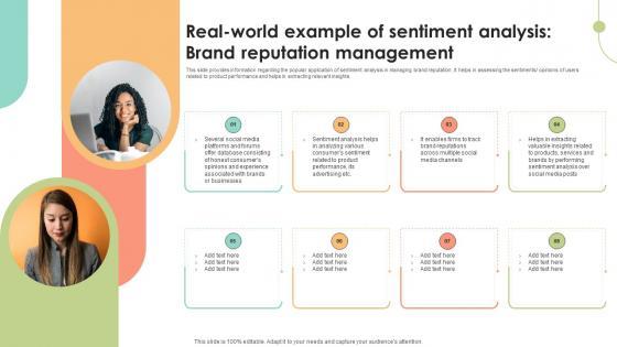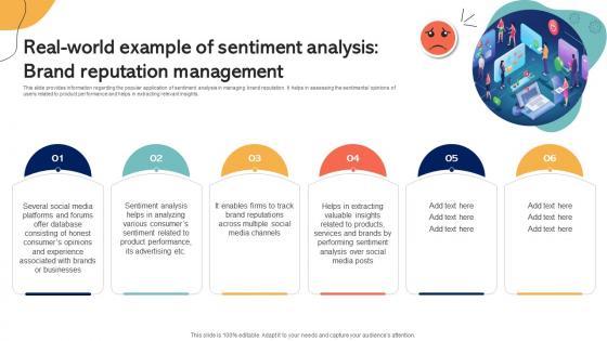 This slide provides information regarding the popular application of sentiment analysis in managing brand reputation. It helps in assessing the sentiments or opinions of users related to product performance and helps in extracting relevant insights. Want to ace your presentation in front of a live audience Our Real World Example Of Sentiment Analysis Brand Emotionally Intelligent Insights Leveraging AI SS V can help you do that by engaging all the users towards you. Slidegeeks experts have put their efforts and expertise into creating these impeccable powerpoint presentations so that you can communicate your ideas clearly. Moreover, all the templates are customizable, and easy-to-edit and downloadable. Use these for both personal and commercial use. This slide provides information regarding the popular application of sentiment analysis in managing brand reputation. It helps in assessing the sentiments or opinions of users related to product performance and helps in extracting relevant insights.
