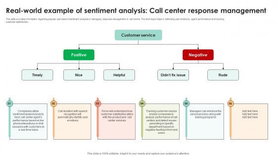 This slide provides information regarding popular use case of sentiment analysis in managing response management in call centre. The technique helps in detecting user emotions, agent performance and tracking customer satisfaction. Want to ace your presentation in front of a live audience Our Real World Example Of Sentiment Analysis Call Sentiment Analysis Demystified Understanding AI SS V can help you do that by engaging all the users towards you. Slidegeeks experts have put their efforts and expertise into creating these impeccable powerpoint presentations so that you can communicate your ideas clearly. Moreover, all the templates are customizable, and easy-to-edit and downloadable. Use these for both personal and commercial use. This slide provides information regarding popular use case of sentiment analysis in managing response management in call centre. The technique helps in detecting user emotions, agent performance and tracking customer satisfaction.