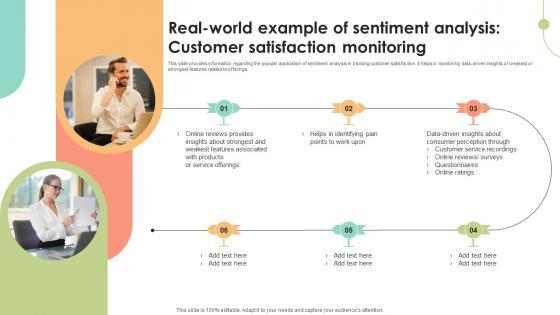 This slide provides information regarding the popular application of sentiment analysis in tracking customer satisfaction. It helps in monitoring data-driven insights of weakest or strongest features related to offerings. From laying roadmaps to briefing everything in detail, our templates are perfect for you. You can set the stage with your presentation slides. All you have to do is download these easy-to-edit and customizable templates. Real World Example Of Sentiment Decoding User Emotions In Depth Exploration AI SS V will help you deliver an outstanding performance that everyone would remember and praise you for. Do download this presentation today. This slide provides information regarding the popular application of sentiment analysis in tracking customer satisfaction. It helps in monitoring data-driven insights of weakest or strongest features related to offerings.