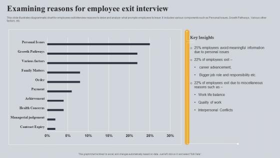 This slide illustrates diagrammatic chart for employees exit interview reasons to delve and analyze what prompts employees to leave. It includes various components such as Personal Issues, Growth Pathways, Various other factors, etc. Showcasing this set of slides titled Examining Reasons For Employee Exit Interview Guidelines Pdf The topics addressed in these templates are Examining Reasons For Employee, Exit Interview All the content presented in this PPT design is completely editable. Download it and make adjustments in color, background, font etc. as per your unique business setting. This slide illustrates diagrammatic chart for employees exit interview reasons to delve and analyze what prompts employees to leave. It includes various components such as Personal Issues, Growth Pathways, Various other factors, etc.