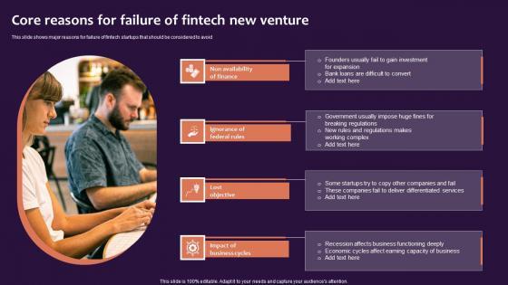 This slide shows major reasons for failure of fintech startups that should be considered to avoid. Pitch your topic with ease and precision using this Core Reasons For Failure Of Fintech New Venture Guidelines Pdf. This layout presents information on Non Availability, Ignorance Of Federal Rules, Lost Objective. It is also available for immediate download and adjustment. So, changes can be made in the color, design, graphics or any other component to create a unique layout. This slide shows major reasons for failure of fintech startups that should be considered to avoid.