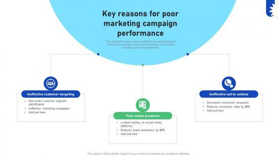 This slide showcases causes related to poor performance of marketing campaign such as lack of strategy, inconsistent branding, lack of investment etc. Retrieve professionally designed Improving Business Marketing Performance Key Reasons For Poor Marketing CRP DK SS V to effectively convey your message and captivate your listeners. Save time by selecting pre-made slideshows that are appropriate for various topics, from business to educational purposes. These themes come in many different styles, from creative to corporate, and all of them are easily adjustable and can be edited quickly. Access them as PowerPoint templates or as Google Slides themes. You do not have to go on a hunt for the perfect presentation because Slidegeeks got you covered from everywhere. This slide showcases causes related to poor performance of marketing campaign such as lack of strategy, inconsistent branding, lack of investment etc.
