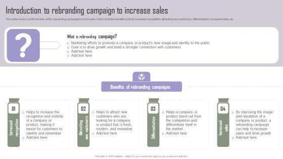 This slide covers a brief overview of the rebranding campaign to boost sales. It also includes benefits such as increased recognition, attracting new customers, differentiation, increased sales, etc. Retrieve professionally designed Introduction To Rebranding Implementing Marketing Tactics To Drive Themes Pdf to effectively convey your message and captivate your listeners. Save time by selecting pre made slideshows that are appropriate for various topics, from business to educational purposes. These themes come in many different styles, from creative to corporate, and all of them are easily adjustable and can be edited quickly. Access them as PowerPoint templates or as Google Slides themes. You do not have to go on a hunt for the perfect presentation because Slidegeeks got you covered from everywhere. This slide covers a brief overview of the rebranding campaign to boost sales. It also includes benefits such as increased recognition, attracting new customers, differentiation, increased sales, etc.