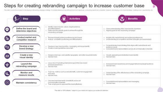 This slide covers the process for developing a rebranding campaign strategy. It includes steps such as defining brand and objectives, conducting market and competitor research, developing a new brand strategy, creating a new visual identity, etc. The best PPT templates are a great way to save time, energy, and resources. Slidegeeks have 100 percent editable powerpoint slides making them incredibly versatile. With these quality presentation templates, you can create a captivating and memorable presentation by combining visually appealing slides and effectively communicating your message. Download Steps For Creating Rebranding Campaign To Increase Powerful Marketing Techniques Strategy SS V from Slidegeeks and deliver a wonderful presentation. This slide covers the process for developing a rebranding campaign strategy. It includes steps such as defining brand and objectives, conducting market and competitor research, developing a new brand strategy, creating a new visual identity, etc.