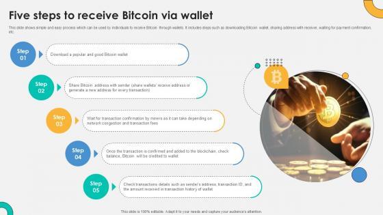 This slide shows simple and easy process which can be used by individuals to receive Bitcoin through wallets. It includes steps such as downloading Bitcoin wallet, sharing address with receiver, waiting for payment confirmation, etc. This Five Steps To Receive Bitcoin Via Everything About Bitcoin PPT PowerPoint Fin SS V is perfect for any presentation, be it in front of clients or colleagues. It is a versatile and stylish solution for organizing your meetings. The Five Steps To Receive Bitcoin Via Everything About Bitcoin PPT PowerPoint Fin SS V features a modern design for your presentation meetings. The adjustable and customizable slides provide unlimited possibilities for acing up your presentation. Slidegeeks has done all the homework before launching the product for you. So, do not wait, grab the presentation templates today This slide shows simple and easy process which can be used by individuals to receive Bitcoin through wallets. It includes steps such as downloading Bitcoin wallet, sharing address with receiver, waiting for payment confirmation, etc.