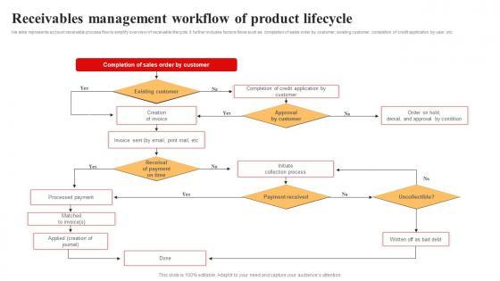 his slide represents account receivable process flow to simplify overview of receivable lifecycle. It further includes factors flows such as completion of sales order by customer, existing customer, completion of credit application by user, etc Pitch your topic with ease and precision using this Receivables Management Workflow Of Product Lifecycle Inspiration Pdf. This layout presents information on Existing Customer, Credit Application, Initiate Collection Process. It is also available for immediate download and adjustment. So, changes can be made in the color, design, graphics or any other component to create a unique layout. his slide represents account receivable process flow to simplify overview of receivable lifecycle. It further includes factors flows such as completion of sales order by customer, existing customer, completion of credit application by user, etc