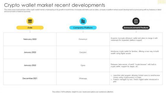 This slide covers brief overview of the crypto wallet market, emphasizing on its growth in recent times. It includes elements such as dates, company or platform where recent development occurred along with key features or latest announcements or features launched. This modern and well-arranged Mastering Blockchain Wallets Crypto Wallet Market Recent Developments BCT SS V provides lots of creative possibilities. It is very simple to customize and edit with the Powerpoint Software. Just drag and drop your pictures into the shapes. All facets of this template can be edited with Powerpoint, no extra software is necessary. Add your own material, put your images in the places assigned for them, adjust the colors, and then you can show your slides to the world, with an animated slide included. This slide covers brief overview of the crypto wallet market, emphasizing on its growth in recent times. It includes elements such as dates, company or platform where recent development occurred along with key features or latest announcements or features launched.