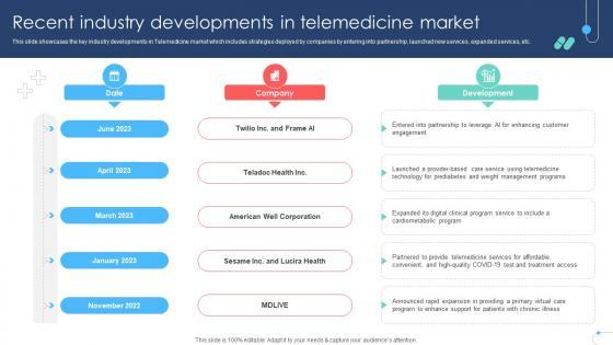 This slide showcases the key industry developments in Telemedicine market which includes strategies deployed by companies by entering into partnership, launched new services, expanded services, etc. Explore a selection of the finest Recent Industry Developments In Telemedicine Market Remote Healthcare Services IR SS V here. With a plethora of professionally designed and pre-made slide templates, you can quickly and easily find the right one for your upcoming presentation. You can use our Recent Industry Developments In Telemedicine Market Remote Healthcare Services IR SS V to effectively convey your message to a wider audience. Slidegeeks has done a lot of research before preparing these presentation templates. The content can be personalized and the slides are highly editable. Grab templates today from Slidegeeks. This slide showcases the key industry developments in Telemedicine market which includes strategies deployed by companies by entering into partnership, launched new services, expanded services, etc.