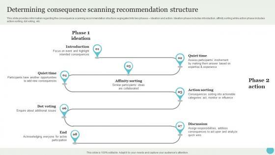 This slide provides information regarding the consequence scanning recommendation structure segregated into two phases ideation and action. Ideation phase includes introduction, affinity sorting while action phase includes action sorting, dot voting, etc. Whether you have daily or monthly meetings, a brilliant presentation is necessary. Determining Consequence Scanning Recommendation Crafting A Sustainable Company Pictures Pdf can be your best option for delivering a presentation. Represent everything in detail using Determining Consequence Scanning Recommendation Crafting A Sustainable Company Pictures Pdf and make yourself stand out in meetings. The template is versatile and follows a structure that will cater to your requirements. All the templates prepared by Slidegeeks are easy to download and edit. Our research experts have taken care of the corporate themes as well. So, give it a try and see the results. This slide provides information regarding the consequence scanning recommendation structure segregated into two phases ideation and action. Ideation phase includes introduction, affinity sorting while action phase includes action sorting, dot voting, etc.