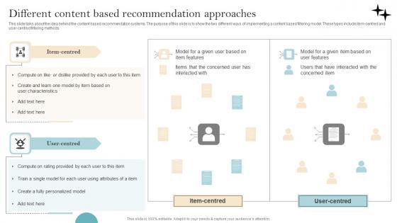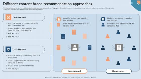 This slide talks about the idea behind the content based recommendation systems. The purpose of this slide is to show the two different ways of implementing a content based filtering model. These types include item-centred and user-centred filtering methods. Explore a selection of the finest Recommendation Techniques Different Content Based Recommendation Approaches Sample PDF here. With a plethora of professionally designed and pre-made slide templates, you can quickly and easily find the right one for your upcoming presentation. You can use our Recommendation Techniques Different Content Based Recommendation Approaches Sample PDF to effectively convey your message to a wider audience. Slidegeeks has done a lot of research before preparing these presentation templates. The content can be personalized and the slides are highly editable. Grab templates today from Slidegeeks. This slide talks about the idea behind the content based recommendation systems. The purpose of this slide is to show the two different ways of implementing a content based filtering model. These types include item-centred and user-centred filtering methods.
