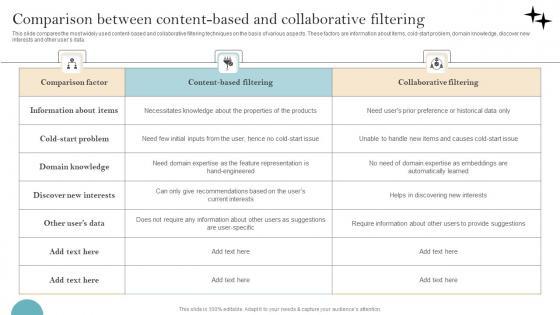 This slide compares the most widely used content-based and collaborative filtering techniques on the basis of various aspects. These factors are information about items, cold-start problem, domain knowledge, discover new interests and other users data. Formulating a presentation can take up a lot of effort and time, so the content and message should always be the primary focus. The visuals of the PowerPoint can enhance the presenters message, so our Recommender System Implementation Comparison Between Content Based Template Pdf was created to help save time. Instead of worrying about the design, the presenter can concentrate on the message while our designers work on creating the ideal templates for whatever situation is needed. Slidegeeks has experts for everything from amazing designs to valuable content, we have put everything into Recommender System Implementation Comparison Between Content Based Template Pdf This slide compares the most widely used content-based and collaborative filtering techniques on the basis of various aspects. These factors are information about items, cold-start problem, domain knowledge, discover new interests and other users data.
