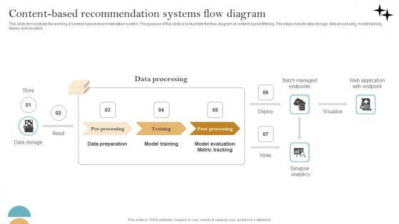This slide demonstrate the working of content based recommendation system. The purpose of this slide is to illustrate the flow diagram of content based filtering. The steps include data storage, data processing, model training, deploy and visualize. Are you in need of a template that can accommodate all of your creative concepts This one is crafted professionally and can be altered to fit any style. Use it with Google Slides or PowerPoint. Include striking photographs, symbols, depictions, and other visuals. Fill, move around, or remove text boxes as desired. Test out color palettes and font mixtures. Edit and save your work, or work with colleagues. Download Content Based Recommendation Systems Flow Diagram Use Cases Of Filtering Methods Mockup Pdf and observe how to make your presentation outstanding. Give an impeccable presentation to your group and make your presentation unforgettable. This slide demonstrate the working of content based recommendation system. The purpose of this slide is to illustrate the flow diagram of content based filtering. The steps include data storage, data processing, model training, deploy and visualize.