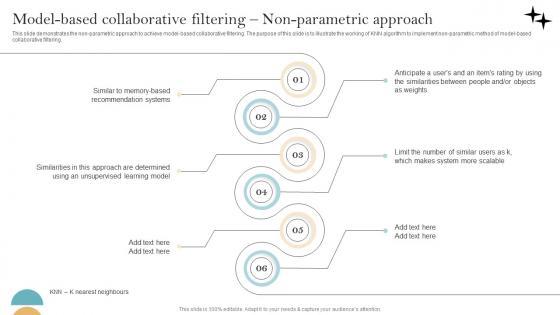This slide demonstrates the non-parametric approach to achieve model-based collaborative filtering. The purpose of this slide is to illustrate the working of KNN algorithm to implement non-parametric method of model-based collaborative filtering. From laying roadmaps to briefing everything in detail, our templates are perfect for you. You can set the stage with your presentation slides. All you have to do is download these easy-to-edit and customizable templates. Recommendation Techniques Model Based Collaborative Filtering Non Parametric Designs PDF will help you deliver an outstanding performance that everyone would remember and praise you for. Do download this presentation today. This slide demonstrates the non-parametric approach to achieve model-based collaborative filtering. The purpose of this slide is to illustrate the working of KNN algorithm to implement non-parametric method of model-based collaborative filtering