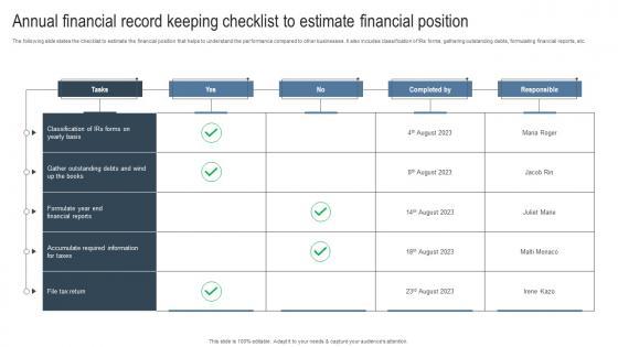 The following slide states the checklist to estimate the financial position that helps to understand the performance compared to other businesses. It also includes classification of IRs forms, gathering outstanding debts, formulating financial reports, etc. Showcasing this set of slides titled Annual Financial Record Keeping Checklist To Estimate Financial Position Microsoft Pdf. The topics addressed in these templates are Tasks, Completed, Responsible. All the content presented in this PPT design is completely editable. Download it and make adjustments in color, background, font etc. as per your unique business setting. The following slide states the checklist to estimate the financial position that helps to understand the performance compared to other businesses. It also includes classification of IRs forms, gathering outstanding debts, formulating financial reports, etc.