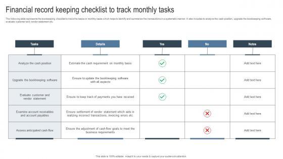 The following slide represents the bookkeeping checklist to trace the tasks on monthly basis which helps to identify and summarize the transactions in a systematic manner. It also includes to analyze the cash position, upgrade the bookkeeping software, evaluate customer and vendor statement etc. Pitch your topic with ease and precision using this Financial Record Keeping Checklist To Track Monthly Tasks Introduction Pdf. This layout presents information on Tasks, Details, Notes. It is also available for immediate download and adjustment. So, changes can be made in the color, design, graphics or any other component to create a unique layout. The following slide represents the bookkeeping checklist to trace the tasks on monthly basis which helps to identify and summarize the transactions in a systematic manner. It also includes to analyze the cash position, upgrade the bookkeeping software, evaluate customer and vendor statement etc.