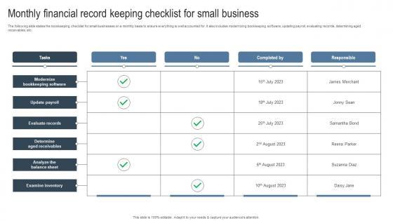 The following slide states the bookkeeping checklist for small businesses on a monthly basis to ensure everything is well accounted for. It also includes modernizing bookkeeping software, updating payroll, evaluating records, determining aged receivables, etc. Showcasing this set of slides titled Monthly Financial Record Keeping Checklist For Small Business Elements Pdf. The topics addressed in these templates are Modernize Bookkeeping Software, Update Payroll, Evaluate Records. All the content presented in this PPT design is completely editable. Download it and make adjustments in color, background, font etc. as per your unique business setting. The following slide states the bookkeeping checklist for small businesses on a monthly basis to ensure everything is well accounted for. It also includes modernizing bookkeeping software, updating payroll, evaluating records, determining aged receivables, etc.