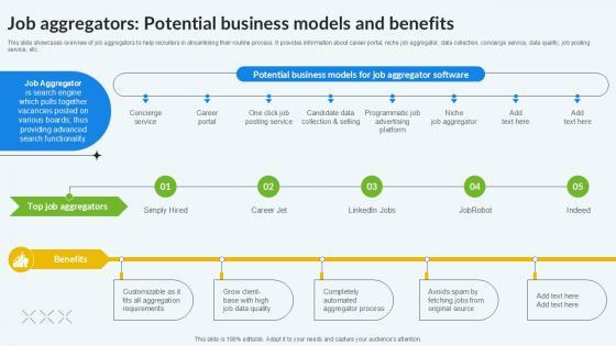 This slide showcases overview of job aggregators to help recruiters in streamlining their routine process. It provides information about career portal, niche job aggregator, data collection, concierge service, data quality, job posting service, etc. Make sure to capture your audiences attention in your business displays with our gratis customizable Job Aggregators Potential Business Cloud Recruiting Technologies PPT PowerPoint. These are great for business strategies, office conferences, capital raising or task suggestions. If you desire to acquire more customers for your tech business and ensure they stay satisfied, create your own sales presentation with these plain slides. This slide showcases overview of job aggregators to help recruiters in streamlining their routine process. It provides information about career portal, niche job aggregator, data collection, concierge service, data quality, job posting service, etc.