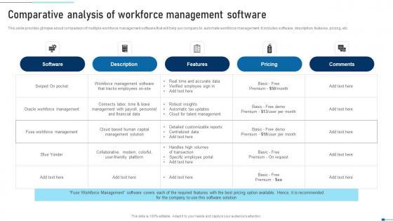 This slide provides glimpse about comparison of multiple workforce management software that will help our company to automate workforce management. It includes software, description, features, pricing, etc. From laying roadmaps to briefing everything in detail, our templates are perfect for you. You can set the stage with your presentation slides. All you have to do is download these easy-to-edit and customizable templates. Comparative Analysis Of Workforce Management Strategic Talent Recruitment Ideas Pdf will help you deliver an outstanding performance that everyone would remember and praise you for. Do download this presentation today. This slide provides glimpse about comparison of multiple workforce management software that will help our company to automate workforce management. It includes software, description, features, pricing, etc.