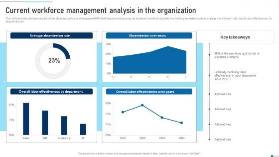 This slide provides glimpse about analysis of current workforce management KPIs that help us in increasing our business overall productivity. It includes parameters such as average absenteeism rate, overall labor effectiveness by department, etc. Whether you have daily or monthly meetings, a brilliant presentation is necessary. Current Workforce Management Analysis In The Strategic Talent Recruitment Pictures Pdf can be your best option for delivering a presentation. Represent everything in detail using Current Workforce Management Analysis In The Strategic Talent Recruitment Pictures Pdf and make yourself stand out in meetings. The template is versatile and follows a structure that will cater to your requirements. All the templates prepared by Slidegeeks are easy to download and edit. Our research experts have taken care of the corporate themes as well. So, give it a try and see the results. This slide provides glimpse about analysis of current workforce management KPIs that help us in increasing our business overall productivity. It includes parameters such as average absenteeism rate, overall labor effectiveness by department, etc.