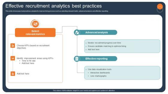 This slide showcases best practices adopted to improve hiring process such as selecting relevant metric, advanced analysis and effective reporting. Make sure to capture your audiences attention in your business displays with our gratis customizable Transforming Recruitment Process Effective Recruitment Analytics Best Practices CRP DK SS. These are great for business strategies, office conferences, capital raising or task suggestions. If you desire to acquire more customers for your tech business and ensure they stay satisfied, create your own sales presentation with these plain slides. This slide showcases best practices adopted to improve hiring process such as selecting relevant metric, advanced analysis and effective reporting.