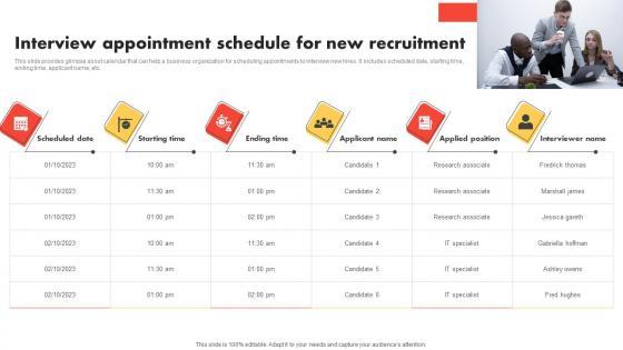 This slide provides glimpse about calendar that can help a business organization for scheduling appointments to interview new hires. It includes scheduled date, starting time, ending time, applicant name, etc. Find highly impressive Interview Appointment Modern And Advanced HR Recruitment Background Pdf on Slidegeeks to deliver a meaningful presentation. You can save an ample amount of time using these presentation templates. No need to worry to prepare everything from scratch because Slidegeeks experts have already done a huge research and work for you. You need to download Interview Appointment Modern And Advanced HR Recruitment Background Pdf for your upcoming presentation. All the presentation templates are 100 percent editable and you can change the color and personalize the content accordingly. Download now. This slide provides glimpse about calendar that can help a business organization for scheduling appointments to interview new hires. It includes scheduled date, starting time, ending time, applicant name, etc.