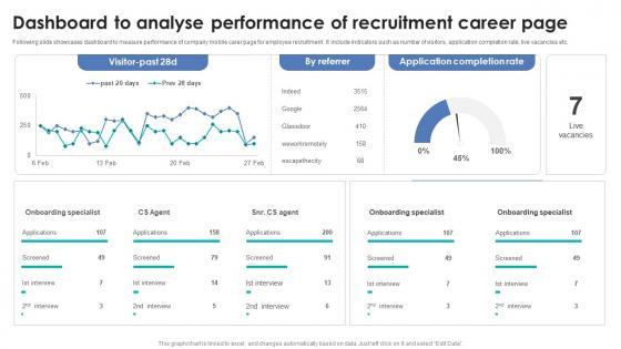 Following slide showcases dashboard to measure performance of company mobile carer page for employee recruitment . It include indicators such as number of visitors, application completion rate, live vacancies etc. Present like a pro with Integrating Automation For Effective Business Dashboard To Analyse Performance Of Recruitment. Create beautiful presentations together with your team, using our easy-to-use presentation slides. Share your ideas in real-time and make changes on the fly by downloading our templates. So whether you are in the office, on the go, or in a remote location, you can stay in sync with your team and present your ideas with confidence. With Slidegeeks presentation got a whole lot easier. Grab these presentations today. Following slide showcases dashboard to measure performance of company mobile carer page for employee recruitment . It include indicators such as number of visitors, application completion rate, live vacancies etc.