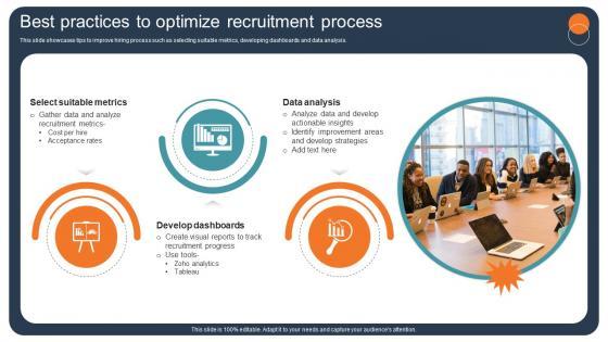 This slide showcases tips to improve hiring process such as selecting suitable metrics, developing dashboards and data analysis. Slidegeeks is here to make your presentations a breeze with Data Driven Approach To Optimise Best Practices To Optimize Recruitment Process CRP SS V With our easy-to-use and customizable templates, you can focus on delivering your ideas rather than worrying about formatting. With a variety of designs to choose from, you are sure to find one that suits your needs. And with animations and unique photos, illustrations, and fonts, you can make your presentation pop. So whether you are giving a sales pitch or presenting to the board, make sure to check out Slidegeeks first This slide showcases tips to improve hiring process such as selecting suitable metrics, developing dashboards and data analysis.