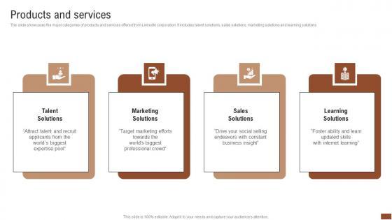 The slide showcases the major categories of products and services offered from LinkedIn corporation. It includes talent solutions, sales solutions, marketing solutions and learning solutions. Make sure to capture your audiences attention in your business displays with our gratis customizable Products And Services Talent Recruitment Company Outline Microsoft Pdf. These are great for business strategies, office conferences, capital raising or task suggestions. If you desire to acquire more customers for your tech business and ensure they stay satisfied, create your own sales presentation with these plain slides. The slide showcases the major categories of products and services offered from LinkedIn corporation. It includes talent solutions, sales solutions, marketing solutions and learning solutions.