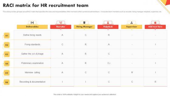 This slide provides glimpse about RACI matrix that specifies the roles and responsibilities of the members of the current recruitment team . It includes team members such as recruiter, hiring manager, helpdesk, supervisor, etc. Make sure to capture your audiences attention in your business displays with our gratis customizable RACI Matrix For HR Recruitment Team Modern And Advanced HR Recruitment Icons Pdf. These are great for business strategies, office conferences, capital raising or task suggestions. If you desire to acquire more customers for your tech business and ensure they stay satisfied, create your own sales presentation with these plain slides. This slide provides glimpse about RACI matrix that specifies the roles and responsibilities of the members of the current recruitment team . It includes team members such as recruiter, hiring manager, helpdesk, supervisor, etc.
