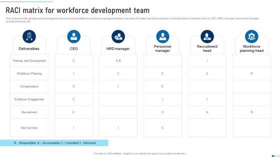 This slide provides glimpse about assigning roles and responsibilities to workforce management team members for better reporting structure. It includes team members such as CEO, HRD manager, personnel manager, recruitment head, etc. This RACI Matrix For Workforce Development Team Strategic Talent Recruitment Introduction Pdf is perfect for any presentation, be it in front of clients or colleagues. It is a versatile and stylish solution for organizing your meetings. The RACI Matrix For Workforce Development Team Strategic Talent Recruitment Introduction Pdf features a modern design for your presentation meetings. The adjustable and customizable slides provide unlimited possibilities for acing up your presentation. Slidegeeks has done all the homework before launching the product for you. So, do not wait, grab the presentation templates today This slide provides glimpse about assigning roles and responsibilities to workforce management team members for better reporting structure. It includes team members such as CEO, HRD manager, personnel manager, recruitment head, etc.