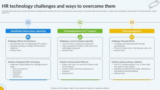 This slide showcases human resource technology challenges which recruiters can refer to overcome their routine solutions. It provides details about reporting, IT support, data management, siloed systems, technical expertise, manual efforts, etc. Are you in need of a template that can accommodate all of your creative concepts This one is crafted professionally and can be altered to fit any style. Use it with Google Slides or PowerPoint. Include striking photographs, symbols, depictions, and other visuals. Fill, move around, or remove text boxes as desired. Test out color palettes and font mixtures. Edit and save your work, or work with colleagues. Download HR Technology Challenges And Ways Enhancing Recruitment Process PPT Example and observe how to make your presentation outstanding. Give an impeccable presentation to your group and make your presentation unforgettable. This slide showcases human resource technology challenges which recruiters can refer to overcome their routine solutions. It provides details about reporting, IT support, data management, siloed systems, technical expertise, manual efforts, etc.