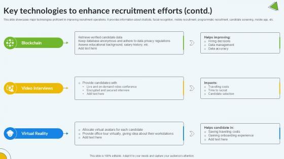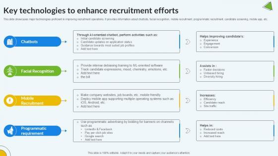 This slide showcases major technologies proficient in improving recruitment operations. It provides information about chatbots, facial recognition, mobile recruitment, programmatic recruitment, candidate screening, mobile app, etc. Formulating a presentation can take up a lot of effort and time, so the content and message should always be the primary focus. The visuals of the PowerPoint can enhance the presenters message, so our Key Technologies To Enhance Enhancing Recruitment Process PPT Example was created to help save time. Instead of worrying about the design, the presenter can concentrate on the message while our designers work on creating the ideal templates for whatever situation is needed. Slidegeeks has experts for everything from amazing designs to valuable content, we have put everything into Key Technologies To Enhance Enhancing Recruitment Process PPT Example This slide showcases major technologies proficient in improving recruitment operations. It provides information about chatbots, facial recognition, mobile recruitment, programmatic recruitment, candidate screening, mobile app, etc.