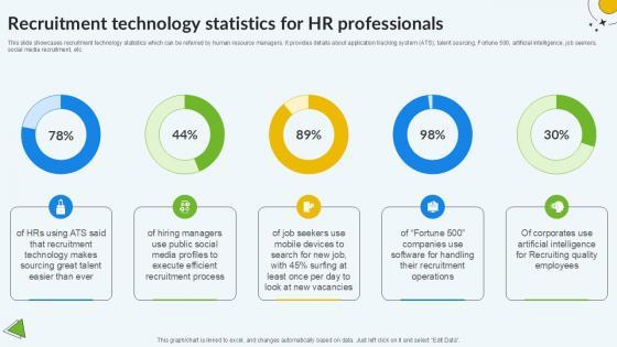 This slide showcases recruitment technology statistics which can be referred by human resource managers. It provides details about application tracking system ATS, talent sourcing, Fortune 500, artificial intelligence, job seekers, social media recruitment, etc. Slidegeeks has constructed Recruitment Technology Statistics For HR Professionals PPT Presentation after conducting extensive research and examination. These presentation templates are constantly being generated and modified based on user preferences and critiques from editors. Here, you will find the most attractive templates for a range of purposes while taking into account ratings and remarks from users regarding the content. This is an excellent jumping-off point to explore our content and will give new users an insight into our top-notch PowerPoint Templates. This slide showcases recruitment technology statistics which can be referred by human resource managers. It provides details about application tracking system ATS, talent sourcing, Fortune 500, artificial intelligence, job seekers, social media recruitment, etc.