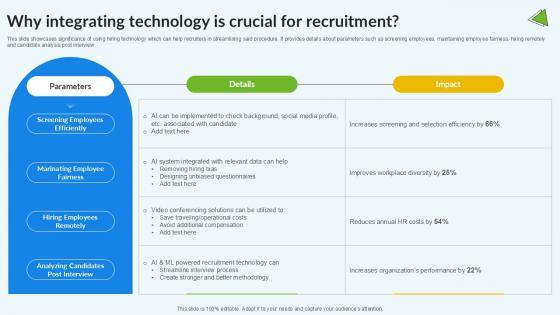 This slide showcases significance of using hiring technology which can help recruiters in streamlining said procedure. It provides details about parameters such as screening employees, maintaining employee fairness, hiring remotely and candidate analysis post interview. Do you have to make sure that everyone on your team knows about any specific topic I yes, then you should give Why Integrating Technology Enhancing Recruitment Process PPT Presentation a try. Our experts have put a lot of knowledge and effort into creating this impeccable Why Integrating Technology Enhancing Recruitment Process PPT Presentation. You can use this template for your upcoming presentations, as the slides are perfect to represent even the tiniest detail. You can download these templates from the Slidegeeks website and these are easy to edit. So grab these today This slide showcases significance of using hiring technology which can help recruiters in streamlining said procedure. It provides details about parameters such as screening employees, maintaining employee fairness, hiring remotely and candidate analysis post interview