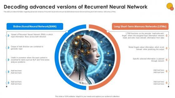 This slide provides information regarding advanced versions of recurrent neural network such as bidirectional neural network and long short-term memory networks LSTMs. Present like a pro with Decoding Advanced Versions Of Recurrent Generative AI For Better Productivity AI SS V. Create beautiful presentations together with your team, using our easy-to-use presentation slides. Share your ideas in real-time and make changes on the fly by downloading our templates. So whether you are in the office, on the go, or in a remote location, you can stay in sync with your team and present your ideas with confidence. With Slidegeeks presentation got a whole lot easier. Grab these presentations today. This slide provides information regarding advanced versions of recurrent neural network such as bidirectional neural network and long short-term memory networks LSTMs.
